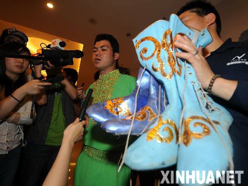 4月24日,新疆“達瓦孜”傳人賽買提·艾山(中)在新聞發布會上接受采訪。當日,賽買提·艾山在新聞發布會上宣布,他將于25日在張家界天門山景區再次進行高空大斜度走鋼絲極限挑戰。今年24歲的賽買提·艾山是新疆“達瓦孜”第七代傳人,已經創造了高空鋼絲倒立時間最長、倒走距離最長以及坡度最陡三項吉尼斯世界紀錄。 新華社記者龍弘濤攝 |