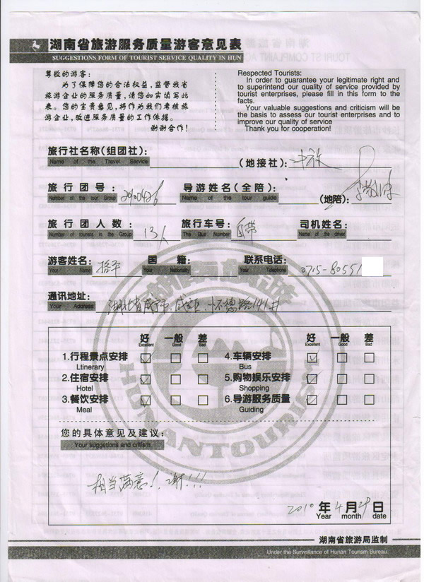 咸寧駱平一行12人旅游質量回饋:相當滿意,謝!
