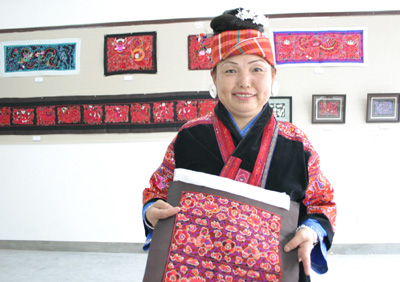土家織錦藝術家葉水云 白布帕子四只角, 四只角上繡雁鵝; 帕子爛了雁鵝在, 不看人材看手腳。 這首山歌唱的是土家姑娘和土家織錦,對土家姑娘和土家織錦進行評價。 世居武陵地區的土家族,是一個精于紡織的民族,土家織錦便是土家族的傳統的工藝品,也稱“ 西蘭卡普”。土家婦女擅長紡織很早就見史籍,早在四千多年前,土家先民就掌握了簡單的紡織技術。秦漢時期,土家人的織錦被稱為“賨布”,曾是皇室的貢品。三國時期,土家人逐步掌握了漢族先進的染色技藝,能夠編織出五彩斑斕的“土錦”《華陽國志》稱之為“蘭干細布”,說它“織成文如綾錦”。唐代稱其為“溪峒布” “溪峒布”工藝已十分精湛,《溪蠻叢笑》描繪它“績五色線為之,文彩斑斕可觀。俗用為被或衣裙,或作巾,故又稱峒布。”宋代以后,土家人的紡織技藝已相當成熟,能夠用絲經棉緯織造色彩絢麗、工藝精巧的織錦──“西蘭卡普”。