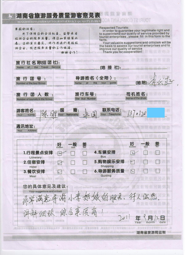 北京陳先生一行9人旅游質量回饋