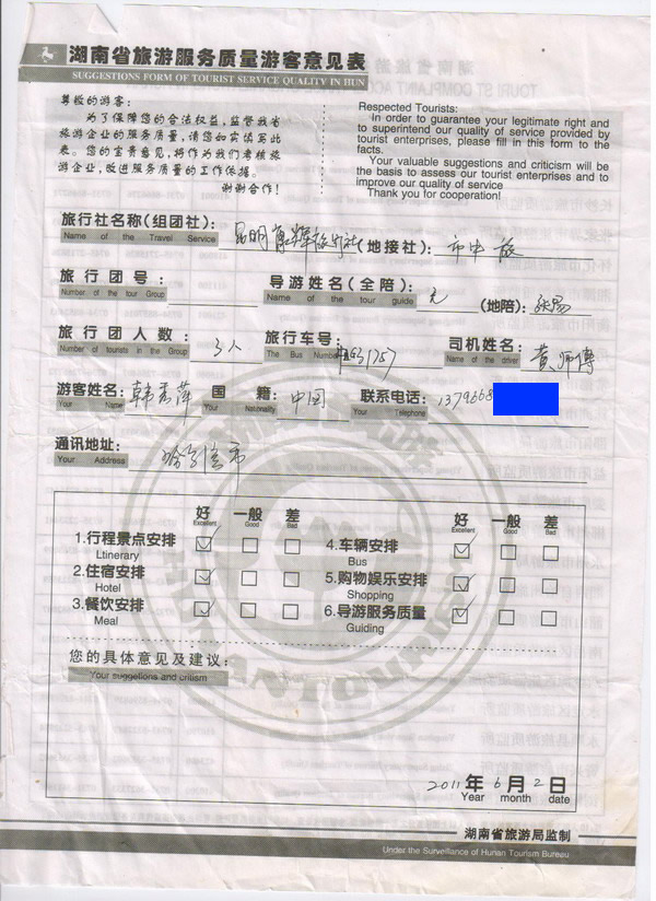 黑龍江哈爾濱韓小姐一行3人旅游質量回饋:都很滿意!