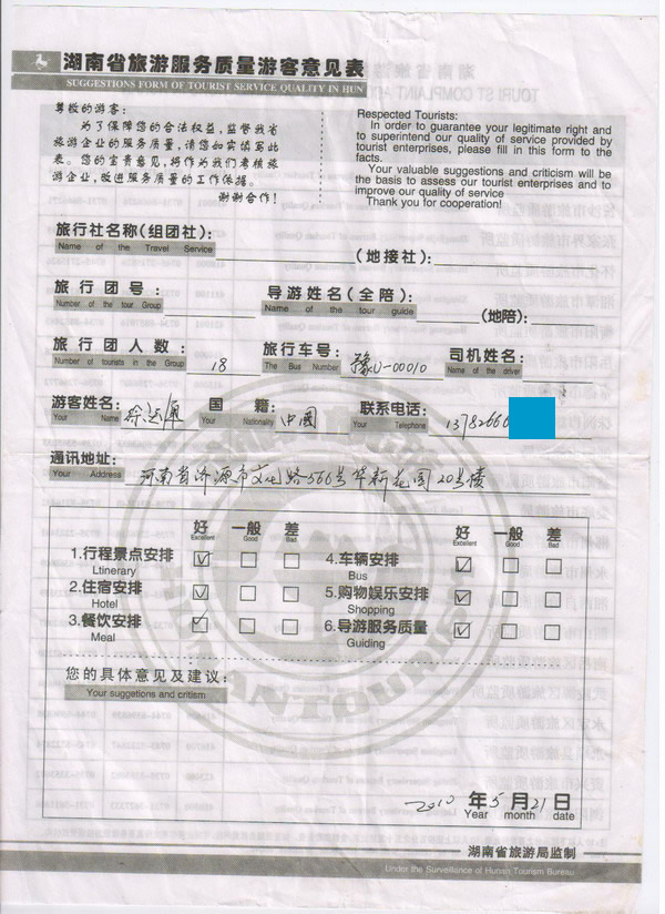 河南徐先生一行18人旅游質量回饋