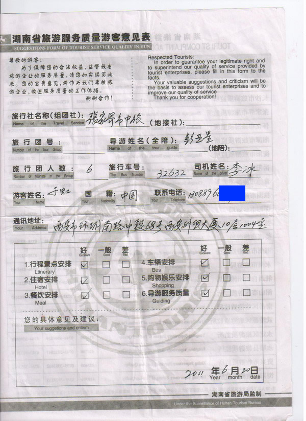 山西于小姐一行6人旅游質量回饋