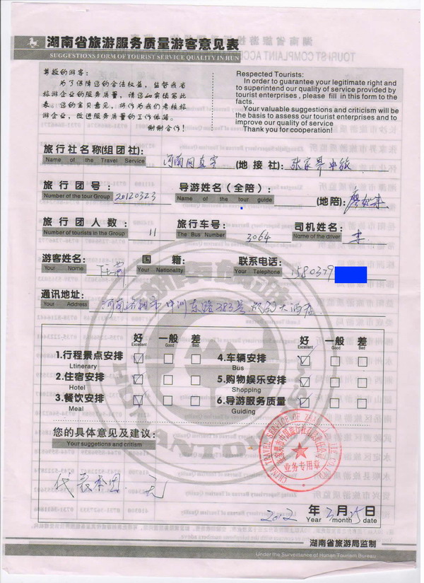 河南任小姐一行11人旅游質量回饋