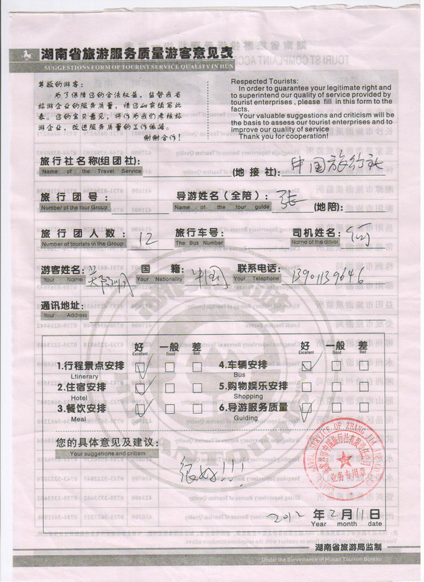 北京鄭先生一行12人旅游質量回饋