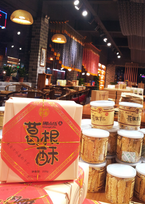 在我快遺忘這件事的時候,接到了小江的電話。小江說在張家界找了很多地方,才在湘小伍·家找到了我想要吃的葛根酥,也只有湘小伍·家才有這個產品。湘小伍·家除了有傳統的葛根粉,也有了新的產品——葛根全原粉,生產工藝是:山中挖掘——水洗表皮泥土——切片——烘干——將葛根片直接磨成300目的粉,此工藝保留了葛根的所有有用物質和微量元素。因為相對來說淀粉的比例變少,沖制時,不會成很稠的糊狀。為保證所有微量元素的價值,建議用攝氏100度的開水涼至80度時沖飲,效果最佳,而且葛根原本的香味更濃。為更方便食用,湘小伍·家用葛根粉、葛根全原粉與面粉按4:6的配比,研發了“葛根酥”產品,用烘培的方法,采用傳統的包裝形式,不僅風味獨特,而且民族特色鮮明,可算是最接地氣的張家界土特產品了,產品一上市,就得到了廣大市民和游客的認同與喜愛,產品極其暢銷。我很快收到了小江寄來的快遞,打開快遞一看見包裝就讓我愈發的想家,小時候過年走親戚帶禮品的老式包裝,懷舊的感覺讓我想起很多回憶,再拆開來品嘗一番,外婆手藝的味道也在嘴里蔓延……