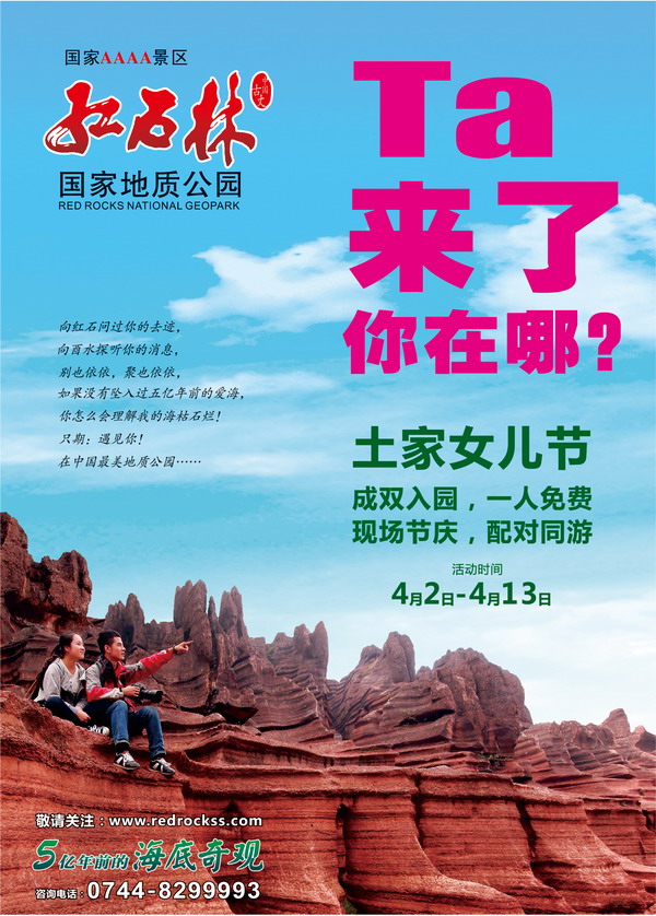 如果你是戀愛人士或已婚,那么恭喜你,將在4月2日—13日期間享受“情侶一票”或“家庭免一票”的優(yōu)惠,和你心愛的他(她)來一場(chǎng)“踩腳定親”吧。別吝嗇你的愛,“秀愛有獎(jiǎng)”環(huán)節(jié)還將見證你們?cè)诩t石林那“?菔癄情亦堅(jiān)”的不渝愛情。