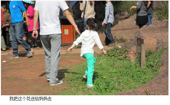 當(dāng)看到路旁的各種野花時,這位小女孩又突發(fā)奇想:“爸爸,等等我,我給媽媽送朵花。”“不要隨便摘花哦。”話音未落,女兒卻早已將野花摘在手上。等趕到媽媽將花送給媽媽時,媽媽的臉上洋溢著的是滿滿的欣慰與幸福,“來我給你插上。”媽媽將小野花插在了小女孩的頭上。