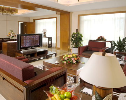 CEO套房,面積110平米,由兩個寬敞的客房和一個大廳組成,不論是從客廳還是從臥室都可看到美麗的園林景觀和室外游泳池。