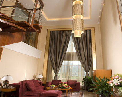 樓中樓套房:面積118平米。客廳寬敞高挑,超大衛生間,時尚的設計讓房間的通風、采光及日照達到極限,窗外可看到百丈峽風景。