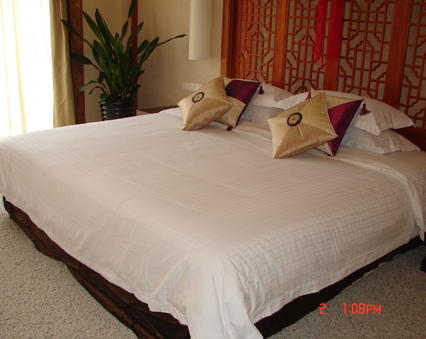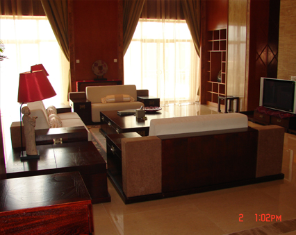 總統套房:面積378平方米,采用復式結構,以其雍容華貴的建筑造型從對稱格局到錯落有致,從豪華的大廳到流動的起居空間,從寬敞的客、餐廳到私密的主臥與書房,所有物品皆是精挑細選的精品,盡顯帝王之風,坐擁君臨天下之勢。