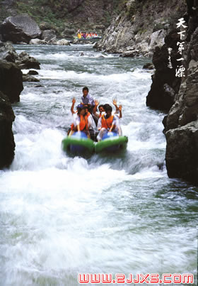 天下第一漂從離王村古鎮(zhèn)十多公里的一個(gè)叫哈妮宮的地方開始,那逼人的綠色,啁啾的鳥音,空靈的水聲便和著峽谷野風(fēng)撲面而來,浸淫你每一寸肌膚。陽光順著長滿戟形葉片的古藤溜下來,猛不丁地被突兀的崖石擊了一掌,扭曲著篩過蓊郁的枝葉,如一枚枚古幣般在綠得有些發(fā)藍(lán)的河上跳躍,閃著古老的光澤。沙灘、卵石、艾嵩、蒲草、漁歌和野性十足的流水,都在以最簡單最直接的方式提醒你;上橡皮舟吧,去漂向神秘,漂向思緒的觸角還沒有過到的地方。