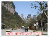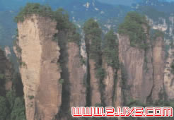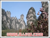 了望臺西南200米處,為黃石寨頂上的一號觀景臺。站在這個上,可以見到一組組的石峰群象一堆堆的盆景羅列在深谷中,既雄奇崔嵬,又富有狂涓氣。一座石峰的頂部分成五根并列屹立的石柱,中間一根較高,象伸開的五根手指。每根石柱上都長有小草雜樹,增添了手指的神秘氣氛。 |