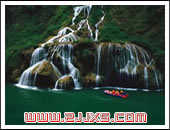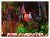 [鴛鴦瀑布]水晶山后有景名叫“鴛鴦”瀑布,像兩條瀑布流下來,科學名稱“石幔”,它本來是一片片很薄的,像紅旗一樣,又稱為“石旗”,它的透光性也特別好,它的形成主要是水從高處往下流時,礦物質的沉淀而形成,它的顏色有白色,有黃色。成為白色的主要是洞頂較厚,水滴下來時,過濾的比較好,含的碳酸鈣比較純,所以顏色成為白色,那么黃色主要是洞頂較薄,水滴下來時沒有很好的過濾,含得碳酸鈣就不純,而且帶有泥質,所以顏色就成黃色。 |