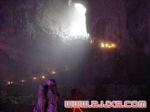 17個國家的20多名洞穴專家三次下九天洞考察,探出洞里面可供游覽的面積是250多萬平方米,分為上、中、下三個主體層次(我們現在 處在第一層,第二、三層還在下面)最低層低于地面470米,洞內有三條陰河,十二條瀑布,十五個潭,二口龍井,五座自生橋,六塊千丘田,三個天然湖,五個池,十余座洞中山,三十六個大廳等等。目前這個洞僅開發了整個面積的十分之一,也就是說我們今天的游覽面積是25萬平方米左右,這其中,我們能看到四個天窗和六個大廳(其它五個天窗和大廳在尚未開發的地方),整個游程是8華里(4公里)路,兩個小時左右,請大家做好心理準備。