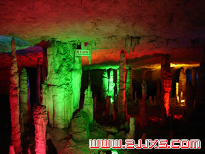 [華表]溶洞里面的景觀主要是由石筍、石鐘乳和石柱構成的,從下面長上去的形狀就是石筍,其中特別粗 大的叫石柱,而從洞上方往下懸掛的就是石鐘乳(又叫鐘乳石),其中順壁而下的較寬的叫石幔。
