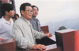 ▲1995年9月8日,全國政協主席李瑞環視察天子山(深圳閣),與總指揮張遠喜同志(右一)親切交談。張遠喜現任武陵源湘深國際旅貿有限公司董事長