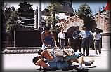 (3)釘刀床破石:地上倒一層碎玻璃片,一人仰臥其上,然后腹上置釘床,又一人仰臥釘床上,再于第二人腹上置刀床,第三人仰臥刀床上,腹部上壓一塊數百斤的大石條,由人掄捶狠砸,至石破為止。