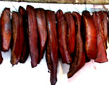 苗家人有一種隔年熏臘肉的習慣。每年臨近年關(guān),殺了年豬,將豬肉切成三至五斤一塊,擦上鹽和各種香料后腌三至五天,待鹽及香料浸進肉內(nèi),再用竹條或藤條穿串掛到火坑上,以煙火慢慢熏干。熏制得比較好的臘肉一般可保存半年以上。如用桔子皮熏烘,臘肉油中透紅,紅中透亮,不見煙灰,顏色更顯好看。臘肉做菜前須洗凈,煮熟、蒸軟、再切片,既可直接蘸酸湯辣子食用,也可加佐料翻炒,香味獨特,菜色亦佳。