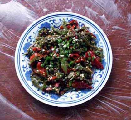 燒辣椒: 山地里,辣椒開花結果以后,苗人最喜從地里摘來青椒,放在火坑里燒燒以后,取出拍凈灰煙,放在巖缽里捶爛,然后放上食鹽,即可以吃。青椒經過燒烤后,既去掉了大部分水氣,又褪去了辣味,吃起來十分可口開胃,特別是久病厭食者,用燒青椒拌飯可以增強食欲,故此,它間接地起著一種健身怯病作用,可稱得上苗家生活偏方。