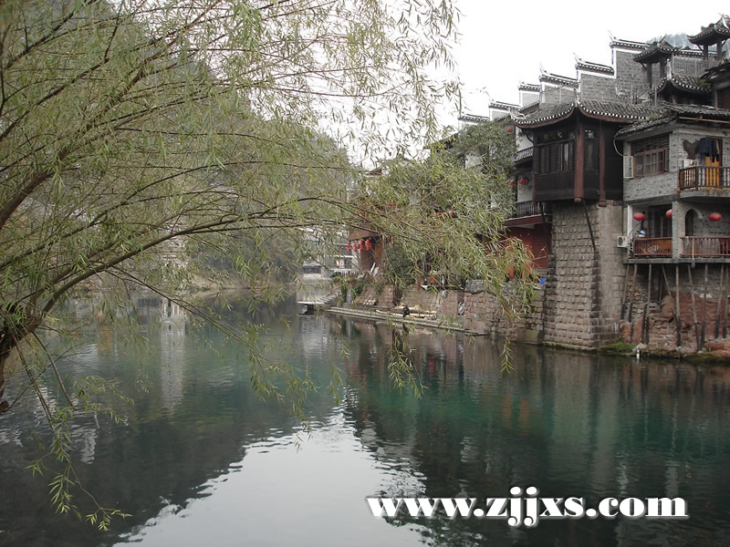 沱江的南岸是古城墻,用紫紅沙石砌成,典雅不失雄偉。城墻有東、北兩座城樓,久經滄桑,依然壯觀。沱江河水清澈,城墻邊的河道很淺,水流悠游緩和,可以看到柔波里招搖的水草,可以撐一支長篙漫溯。沿沱江邊而建的吊腳樓群在東門虹橋和北門跳巖附近,細腳伶仃的立在沱江里,象一幅永不回來的風景。