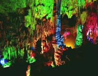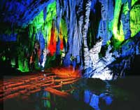 一條小溪穿洞而過,水流平緩,燈光打在巖壁上,皺襞倒影在水中,如夢如幻。 巖洞用五光十色的霓虹燈打在石
