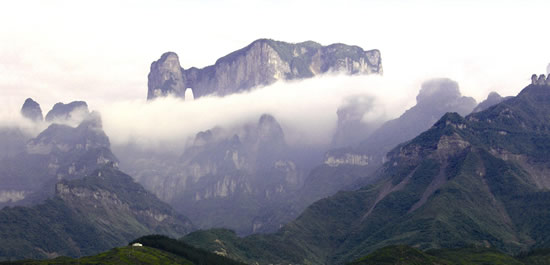 六十八平方公里的山體綿延,卻只有兩平方公里的山頂突起,遠看如畫屏護城,近看為“仙”字鼎立,靜黑的石壁,懸崖上散碎的樹叢,典型的喀斯特地貌讓天門山猶如一副天成的水墨畫。加上獨特的地勢,一年里幾乎三分之二的時間,天門山都是云氣飄蕩,這就更為這副巨大的山水畫增添了幾分空靈的韻味。