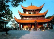 岳陽樓,東倚巴陵山,西臨洞庭湖,雄踞岳陽城西門之上,氣勢非常雄偉,與武昌黃鶴樓,南昌滕王閣并稱為中國江南三 大名樓,歷代文人墨客多會于此,留下了不少千古名篇。據傳,岳陽樓最初是供據守城門的衛兵憩息和了望的譙樓。三國時,東吳大將魯肅在岳陽操練水兵,將其改建為閱軍樓。唐開元四年(公元716年),中書令張說謫守岳陽,對此樓再次進行了擴建,名南樓,又叫岳陽樓。宋慶歷四年(公元1004年),滕子京謫守巴陵郡,重修岳陽樓,并請自己的好友,著名文學家范仲淹作《岳陽樓記》,寫下了"先天下之憂而憂,后天下之樂而樂"的名句,岳陽樓更是名揚天下。在迄今為止的1700多年中,岳陽樓歷盡滄桑,幾經水淹、火燔、雷擊、兵災,但屢毀屢修,古樸之貌代代相襲,始終保持良好。岳陽樓的建筑藝術,真可謂巧奪天工。該樓主樓高19米,為"四柱"、"三層、飛檐、純木"建筑。中間以四根楠木大柱從地到頂,承荷大部分重力,再用12根金柱作為內圍,支撐二樓,外圍繞以20根檐柱,彼此牽制,結為整體,飛檐與屋頂用傘型架傳載負荷。三樓用"如意斗拱"、層疊相襯,拱托樓頂。全樓無一磚石,全用木料構成。閂縫對榫,結構嚴 整,工藝精巧,造型莊重。飛檐、樓頂均蓋黃色琉璃筒瓦,飛檐尖端飾以龍鳳,昂首翹尾即欲騰飛。其三樓樓頂外貌酷似古代將軍頭盔,俗稱盔頂,為我國古代建筑中所罕見