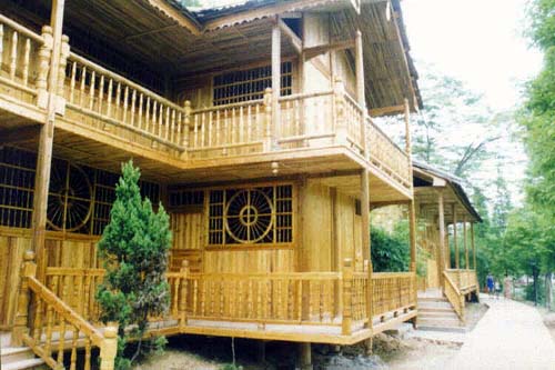 在南嶺深處,處處都可以看到這樣一道獨特的風景線:在藍天碧水之間,群山掩映之中,一座座別致的木樓依山勢而居,在陡峭的山地營造出一塊平坦的人類生息空間。這就是瑤族民居吊腳樓。 瑤族是一個山地民族,住所往往依山旁水建成,其代表作就是人與自然和諧而居的吊腳樓。瑤族人多居住在山區,很少可供成片建造房屋的平地,于是他們便選擇坡度較為平緩的地方,一半平整土地,另一半依據山勢用長短不一的杉木柱頭支撐,架木鋪板,與挖平的屋場地合為一個平坦的整體,再在此整體上建房。山區氣候潮濕多雨而且炎熱,為了通風避潮和防止野獸的侵害,采用了一種房屋下部架空,稱為干欄式的住宅。住宅隨著山勢的高低而建造,前后立柱也隨地勢長短不同地立在陡坡上,房屋分上下兩層,下層多暢空,里面多作牛、豬等牲畜棚及儲存農具與雜物。樓上為客堂與臥室,四周伸出有挑廊,主人可以在廊里做活兒和休息。這些廊子的柱子有的不著地,以便人畜在下面通行,廊子重量完全靠挑出的木梁承受,所以這種住宅往往是里邊靠在山坡上,外邊懸吊在空中,這種建在山坡上的住宅稱為吊腳樓。這種吊腳樓看起來美觀,靈巧別致,凌空欲飛;住起來舒適,干爽透氣,通風采光;有人還說它的建筑藝術體現了瑤族人民“地不平我身平”的哲學思想。