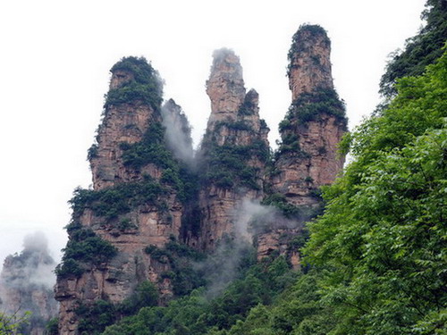 聳立著的三座灰白色的石峰,人稱“三姐妹峰”。每座峰高100多米,上小下大,形似三個穿著花羅裙的苗族少女。她們立在山梁上,亭亭玉立,若有所思,真是神形兼備。相傳這是三個苗姑站在山梁上與情郎對唱情歌,她們情真意切,在這里唱了三天三夜的苗歌。后來天上出現七個日頭,把大地曬裂口了,把樹木曬枯了,把河水曬干了,把她們三個人哩,燒化為石頭了。