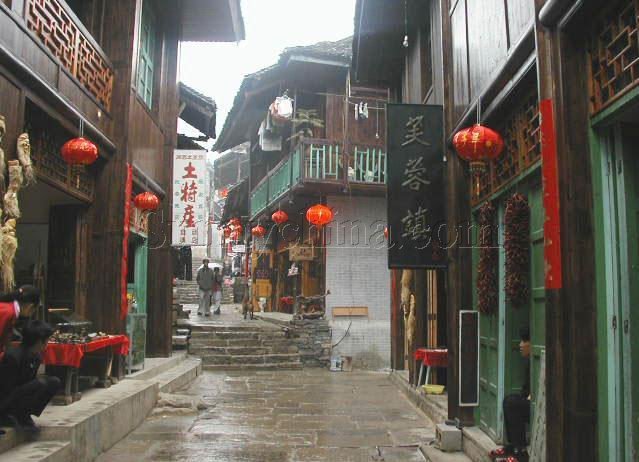 溪洲銅柱現(xiàn)存于芙蓉鎮(zhèn)民俗風光館內(nèi)。公元940年,楚王馬希范與溪州刺使彭士愁多年交戰(zhàn)媾和,締結(jié)盟約,劃疆而冶,鑄5000斤銅柱為證。據(jù)史截:“后晉天福四年(公元939),溪州刺史彭士愁與當時占據(jù)湖南的楚王馬希范發(fā)生溪州之戰(zhàn)。彭士愁戰(zhàn)敗后于后晉天福五年(公元940年)與馬希范議和,把戰(zhàn)爭的經(jīng)過和議和的條款,鐫刻于銅柱之上。銅柱重五千斤,高丈二尺,入土六心,形為八面,中空,內(nèi)實鉅錢,柱端覆蓋銅頂,銘誓狀于銅柱之上,立于會溪,宋天禧二年(公元1018年)重立時,又羼刻了一些土官銜名。清中葉,柱上銅頂被盜,沉于江心,柱內(nèi)銅錢亦被人以飴粘錢殆盡。清光緒十一年(公元1885年),永順府知府張曾揚建亭保護。民國年間亭被毀!便~柱的銅質(zhì),精純光潤;八面所鐫顏、柳體陰文,雖經(jīng)千載風雨洗刷,霜雪蝕磨,仍清晰如初。溪州銅柱是研究土家族古代歷史的重要文獻。土家族視銅柱為神物。 古鎮(zhèn)石板街遠遠望去,總感覺芙蓉鎮(zhèn)五里青石板街就像一本線裝古籍的書脊,書頁被上蒼之手打開,靜謐而又穩(wěn)重地攤在酉水河邊,那書頁上凌空的吊腳樓和發(fā)生在樓里樓外的悲歡離合便隨歲月而動,演繹出許多鏗鏘溫馨、跌宕起伏的故事來…… 湘西芙蓉鎮(zhèn)這個看上去普普通通的村落,原來是秦漢時土王的王都,古稱酉陽,五代十國時稱溪州。后因電影《芙蓉鎮(zhèn)》在此拍攝,于是人們便把此地叫做芙蓉鎮(zhèn)。 史書記載“位酉水北面,是酉水的重要碼頭,通川黔、達鄂瀘,舟楫之便,得天獨厚”。 從碼頭開始綿亙而上的石階,那是一條長達五里貫穿古鎮(zhèn)的青石板路,它沒有名字,于是人們就直接管它叫五里長街。踏上古街,似乎踩在被悠長歲月遺落的碎片上面。不知不覺走到掛有“土家觀瀑吊腳樓”牌匾的民俗博物館前,從手搖腳踏的棉花機、閹豬鳴號的羊角到世代相傳的雕花牙床,近百件散發(fā)著鄉(xiāng)土氣息的民間用具,展示著土家族古老豐富的歷史。看護人說,這是一位土家族年輕人爬山涉水收集來的,靜靜地訴說著這個小村古老的過去。這棟三層的小樓,一半落在河岸上,另一半?yún)s是由水泥柱支撐著,水泥柱直插河底,任水流日日夜夜地沖刷,小小的吊腳樓仍穩(wěn)穩(wěn)當當站在那里,任憑時間的流逝。好聰明的土家人,巧借一片水面,竟建起了如此妖嬈的住房。 拾級而上,山路一般的陡峭。兩旁的青瓦木房鱗次櫛比,順山勢而錯落有致。幾家織錦商店已經(jīng)開門,說是商店,不如叫作坊更確切些,因為店里的主要面積,都為織錦機所占領(lǐng),色彩斑斕的挎包、壁掛、床上用品等都掛在墻上,游客不僅可以駐足欣賞姑娘們的手和梭子在織錦機上飛動的瀟灑,還可以慢慢觀賞陳列品的藝術(shù)特色。據(jù)說,當?shù)氐墓媚镌瓉碇唤o親人和情郎穿針引線,如今卻生產(chǎn)出異彩紛呈的土家織錦來賣給陌生人,從情感所系的“非賣品”到只有技巧表現(xiàn)的商品,這種生活方式和情感上的跨越,仿佛不過是一夜之間的事。 有趣的是,米豆腐沿街都是,每一家都掛出電影《芙蓉鎮(zhèn)》的劇照,以示自己的正宗。其實在電影拍攝之前,米豆腐就早已是這里的特色,為什么要依賴那一個虛構(gòu)的故事呢?20年前,一部電影把“深居閨閣人未識”的這個小小村鎮(zhèn),從地圖上尋找出來,放在世人面前,然后將影響這里的多少代人,甚至深入到他們的骨髓。從那以后,曾經(jīng)與世隔絕的寧靜被打破了,而這種深刻的影響,大概就是從一碗米豆腐開始。 傍晚還剛剛來臨,長街上的小吃店就紛紛亮起昏暗燈光。這些家庭式小店,全都是當?shù)厝藦淖约杭曳殖鲆粔K地方來順帶做的。鮮甜的桂花魚,以及肥美的“天下第一螺”,和米豆腐一樣,成為那里最難忘的美味。在村子里一座貞節(jié)牌坊旁,又發(fā)現(xiàn)清心透涼的另一種美味———冰鎮(zhèn)土家自釀糯米酒。聰明能干的土家人,他們自給自足,自在悠閑地生活著,男人在外打漁,女人在家織布,世世代代,沉浸在自己的文化里面。