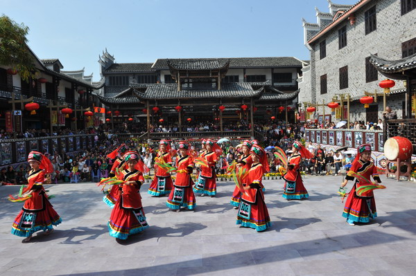 時間尚早,一百多里路程,還是先填飽肚子吧。拱極門邊臨時的表演臺上,一個穿著入時的乾州人,正在工作人員的幫助下,歡天喜地的表演著“人背后頭球”活動。“游湘西,奔乾城,全民參與,老少皆宜”的大字,隱含乾州人對生活的幸福之情。