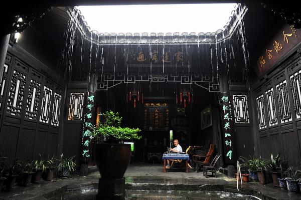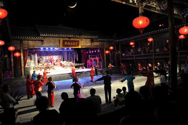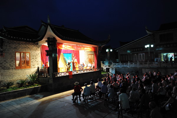 沒走幾步,一支帶著童音的歌聲,從一座木板庭院里傳出,幽雅,張揚,我們循聲走進這棟老屋,庭院里居然是一處表演場,一個小姑娘握著話筒在舞臺上一邊歌唱,一邊表演。這邊觀眾臺前端莊地坐著幾位帶有藝術氣質的中年人,他們在細語,像是在評判著那個姑娘的姿態和演唱。