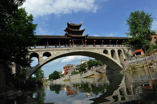 曾經,這里是鳳乾大道的關隘要口,南來北往的商賈軍隊百姓轎抬來到這兒總會被江水吸引,而后坐在橋欄桿邊小憩。微風吹來,陣陣情歌鼓動著人們的心情。橋下,鯉魚翻躍,春光不再。而到了夜晚,兩岸吊腳樓內傳出女子僑情的聲音,自是一番勾魂勒魄的撼動。閑話的人們因此誰愿舍棄這春花秋月的風景而早早地別去呢?
