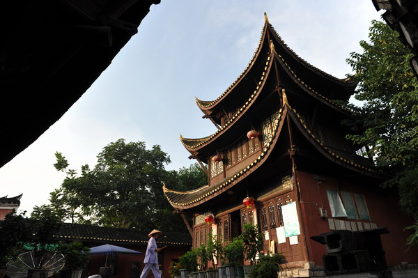 梵鐘聲裊觀音閣,疏柳霞暉吊腳樓。