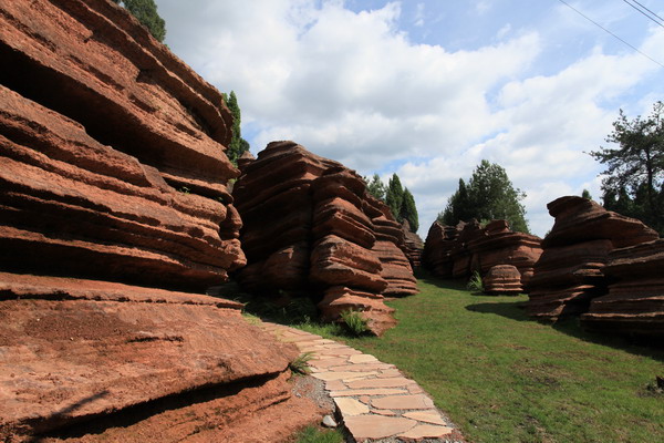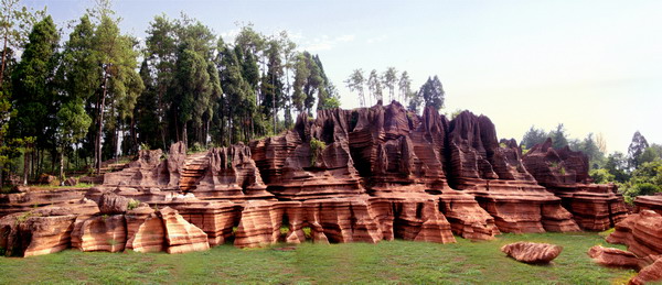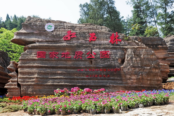 大約在四億八千萬年前的早奧陶時期,紅石林地域屬地史上所稱的揚子古海。海底沉積了大量混合泥沙的碳酸鹽物質,經過地殼運動海底被抬起,在大自然風化、水蝕、溶蝕和重力的外動力地質作用下,形成了這片美麗的地質奇觀——中國唯一的紅色炭酸鹽巖石林。由于巖石物質成分的差異,石牙芽、石林、有多種多樣的顏色。含鐵質較多的,經氧化后形成紅色;含泥質較多的,一般呈灰色、灰綠色;含碳酸鹽較純的,一般呈白色。這樣形成的五彩石林,其中以紅色石林分布最廣,故為紅石林。