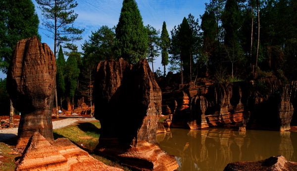 走近紅石林,您將感受到地質遺跡的具象性和地域文化的民族性相融合的天、地、人之間的神秘文化。鳥瞰紅石林,地貌為五個臺地,中低外高成“V”字型向兩側擴展。其中軸線,連貫1、2、3級常年積水的巖溶洼地。根據這一地質遺跡的具象性,人們
