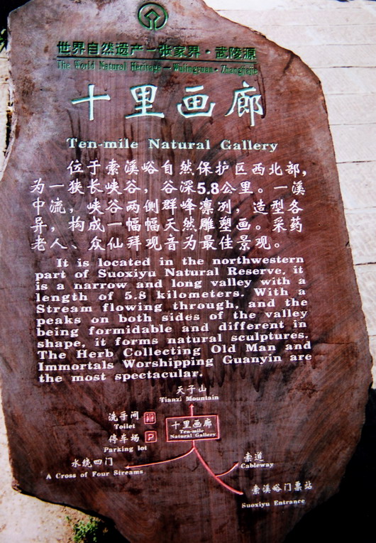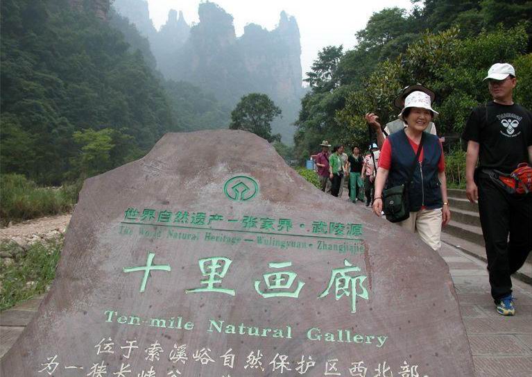 張家界十里畫廊位于索溪峪景區(qū),是該景區(qū)內的旅游精華,在這條長達十余里的山谷兩側,有著豐富的自然景觀,人行其間如在畫中。溝旁黛峰屏列,山上的巖石形成了200來尊似人似物、似鳥似獸的石景造型,其中“孔雀開屏”、“采藥老人”、“壽星迎賓”、“猛虎嘯天”等最為著名。