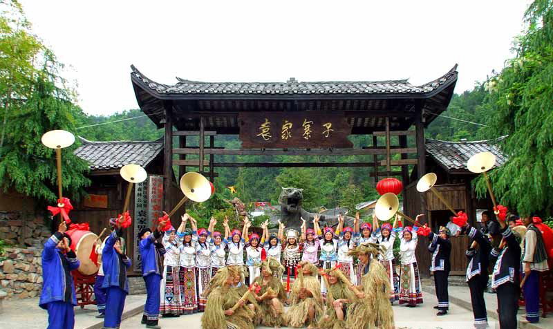 在張家界264平方公里石英砂巖絕壁頂上、3103根神秘山峰之巔至今唯一保存著一座土家山寨----袁家寨子。這里居住著一群喝虎乳長大的土家后裔,他們至今還沿襲200年前的后產、生活方式。這座寨子構建獨特,是按照動物形體建造的仿生建筑。寨民靠耕種“空中田園”為計,為游人現場表演碾、榨、磨、碓、織等原始傳統手藝;通過唱、跳、哭、咒、符等另類的習俗和神秘的信仰,演繹著高山土著民的“人、神、情”秘訣。